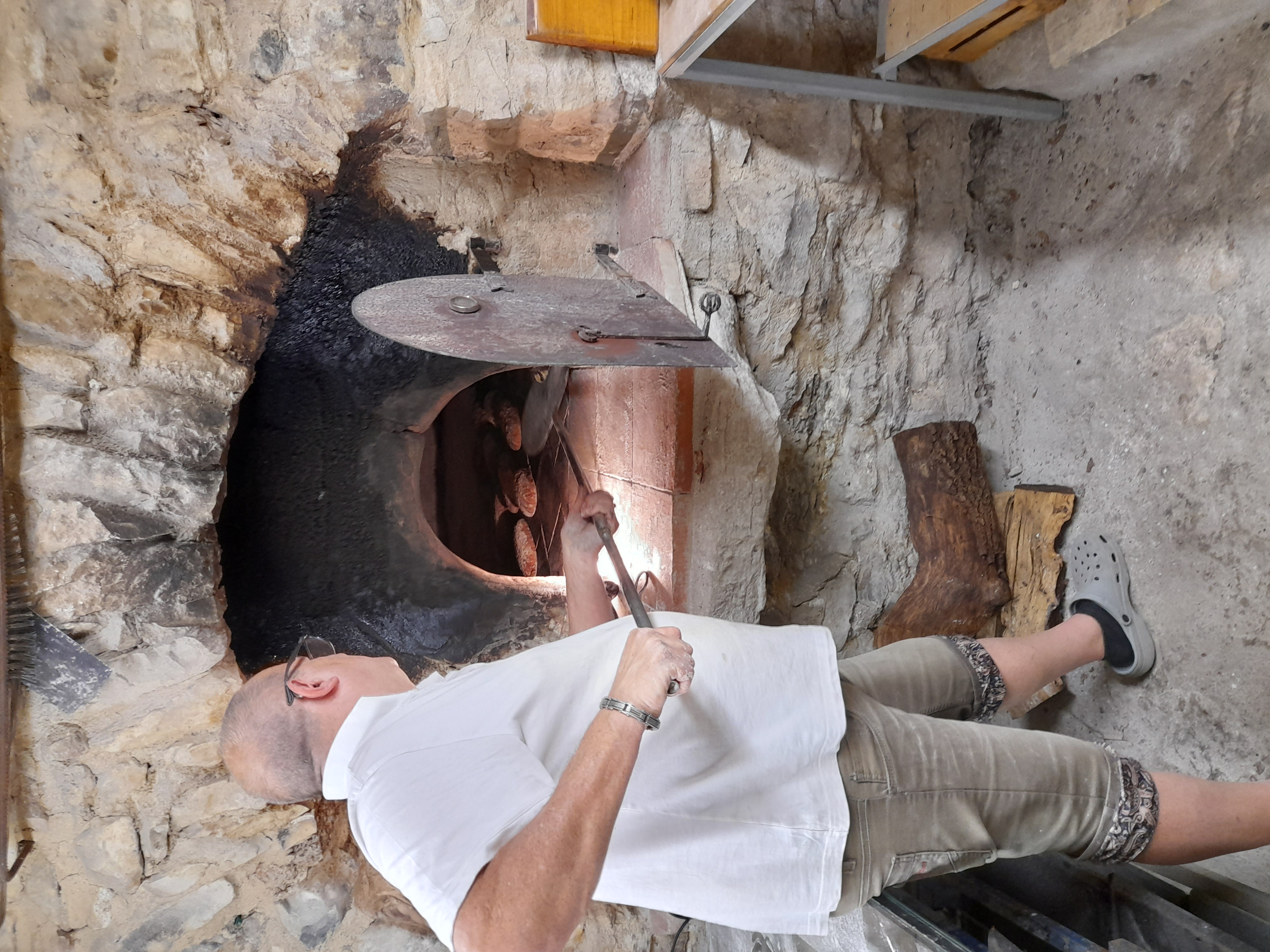 Un repas partagé sur la place avec des plats cuits au four à bois très copieux et délicieux.
