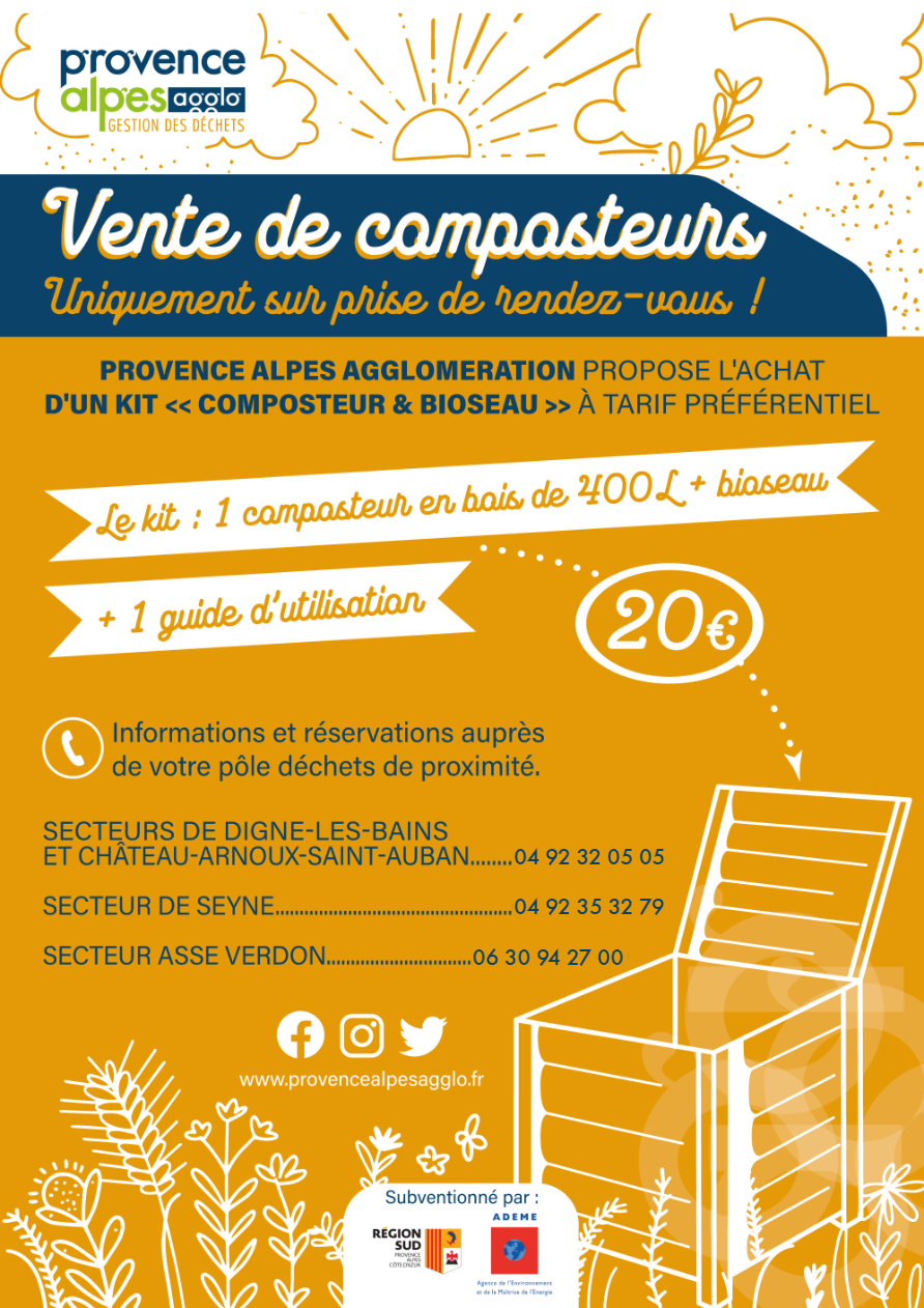 Les ventes s'effectuent sur rendez-vous uniquement auprés des pôles déchets de proximité du service déchets de PAA , le plus proche étant situé à Peyruis: -